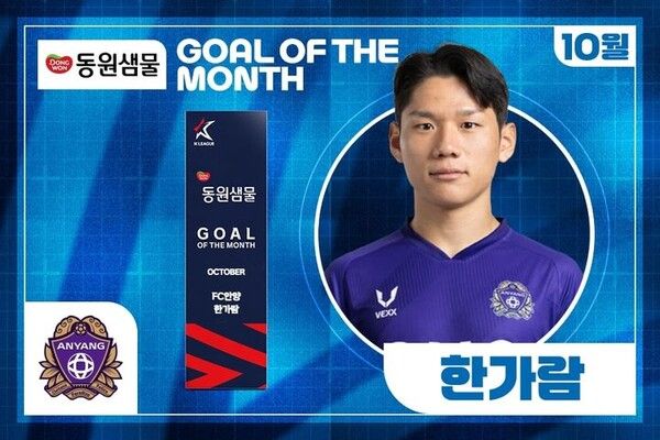 프로축구 K리그를 총괄하는 한국프로축구연맹은 K리그1 FC안양 한가람이 2025시즌 10월 K리그 '안심을 마시다 동원샘물 이달의 골' 수상자로 선정됐다고 12일 밝혔다.