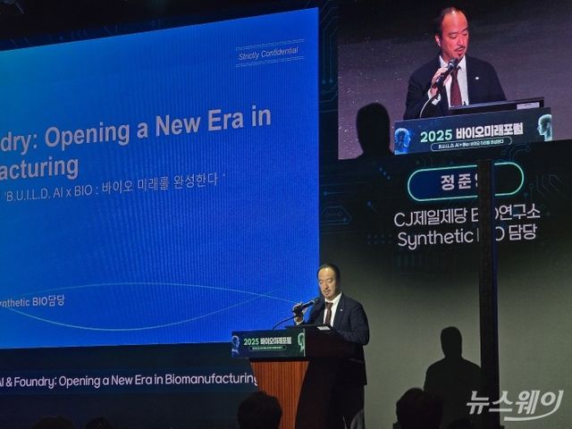 정준영 CJ제일제당 바이오연구소 합성 바이오 담당이 12일 서울 중구 웨스틴조선 호텔에서 열린 2025 바이오미래포럼에 참여해 연설하고 있다.