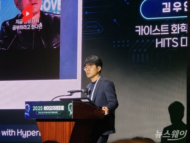 김우연 카이스트 화학과 교수 겸 히츠(HITS) 대표가 12일 서울 중구 웨스틴조선 호텔에서 열린 2025 바이오미래포럼에 참여해 연설하고 있다.