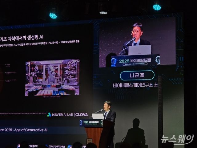 나군호 네이버헬스케어연구소 소장이 12일 서울 중구 웨스틴조선 호텔에서 열린 2025 바이오미래포럼에 참여해 연설하고 있다.