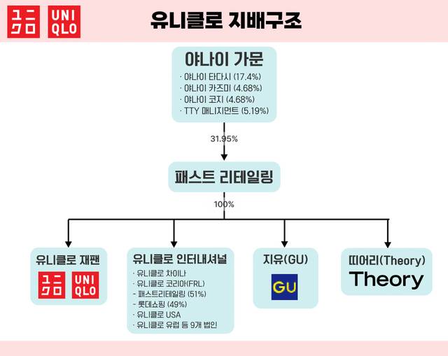 유니클로의 재부상을 주도한 주역으론 그룹 경영을 주도하는 야나이(柳井) 창업주 후손들이 지목됐다. 현재 유니클로 모회사 패스트리테일링의 최대주주는 창업주 3세인 야나이 타다시 회장이다. 올해 8월 31일 기준 17.4%의 지분을 보유 중이다. 장남 야나이 카즈미(4.68%)와 차남 야나이 코지(4.68%), 가족회사인 TTY매니지먼트(5.19%) 등도 패스트리테일링 지분을 가지고 있다. 야나이 가문이 직·간접적으로 보유한 패스트리테일링 지분의 총합은 31.95%에 달한다. 패스트리테일링은 ▲유니클로 재팬 ▲유니클로 인터내셔널 ▲지유(GU) ▲띠어리(Theory) 등 여러 글로벌 브랜드를 자회사로 두고 있다.