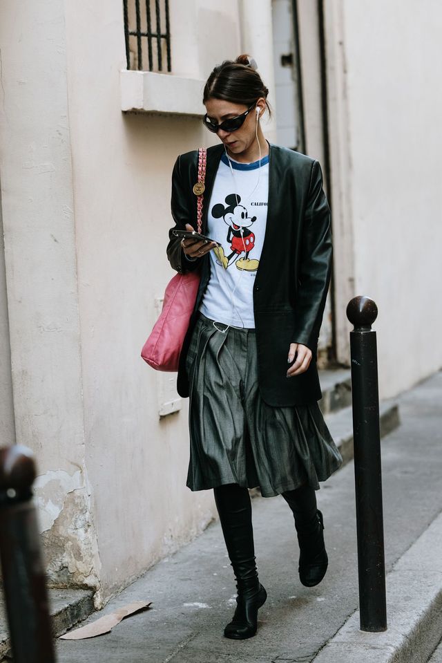 도시적인 아우터의 날카로운 선을 누그러뜨리고 싶다면, 유머가 정답입니다. 귀여운 캐릭터나 로고가 들어간 그래픽 티셔츠는 단번에 룩의 텐션을 바꾸는 마법 같은 아이템이죠. 여기에 플리츠 미디스커트를 매치하면 흐르는 듯한 실루엣이 생겨 전체 룩의 밸런스가 잡힙니다. 강렬한 블랙 부츠로 마무리하면, 어느새 시크함 속의 위트를 완벽히 구현한 자신을 발견하게 될 거예요.
