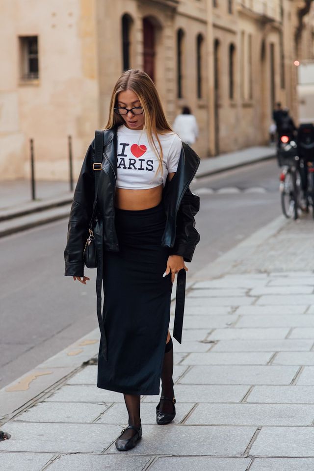 블랙이 지루하다는 편견은 이제 잊으세요. 스트리트 감성을 더하면 블랙은 다시 젊어집니다. 가령 ‘아이 러브 파리’ 프린트 티셔츠를 크롭으로 묶고, 슬릿이 들어간 롱스커트를 더해보세요. 부드러운 가벼움과 묵직한 존재감이 부딪히며 오묘한 긴장감을 만들어낼 테니까요. 액세서리는 최소화하되, 핏과 비율로 시선을 사로잡는 게 포인트입니다. 마치 파리의 거리에서 막 걸어 나온 듯한 자유로움이 전해지죠.