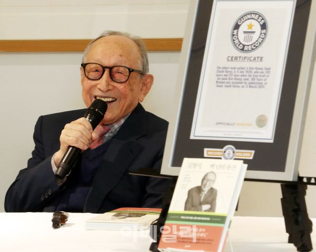 한편 이날 간담회에선 기네스로부터 ‘세계 최고령 저자’로 인정받은 등재 증서 실물도 공개됐다. 지난해 7월 김 교수의 손녀가 기네스에 등재 제안 이메일을 발송했고, 두 달 뒤 승인받았다. 김 교수는 “100살 넘게 산 것이 별일도 아닌데, 손녀 덕분에 기네스에 올랐다”며 “나보다 나이 들어 책을 출판하는 사람도 나올 것이다. 다만 앞으로 내가 책을 1~2권 더 쓰면 어떻게 될지 모르겠다”고 웃었다.