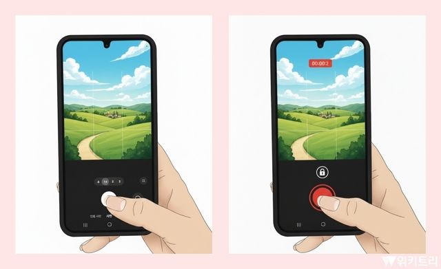 AI로 생성한 갤럭시 셔터 버튼 기능 일러스트. 셔터 버튼을 길게 눌러 자물쇠 아이콘 쪽으로 쓸어 올리면 동영상 모드로 전환한다.