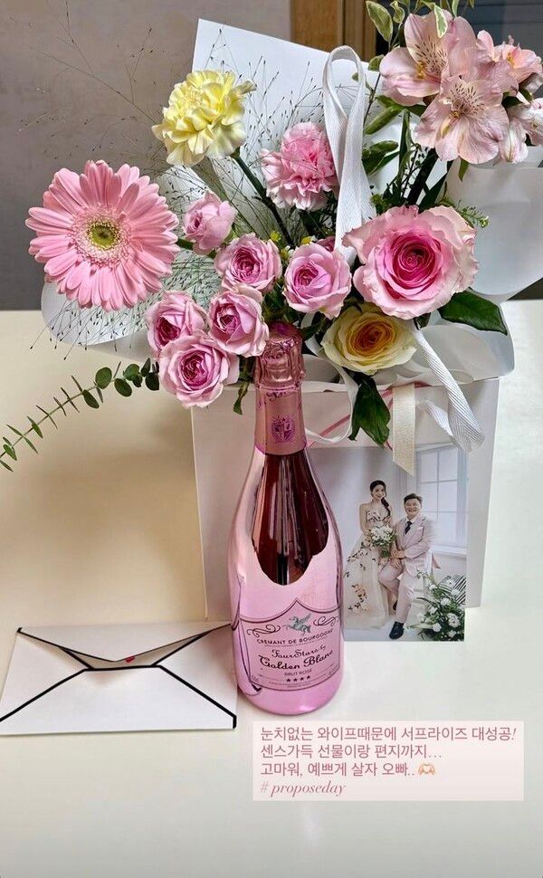 사진에는 화려한 꽃다발이 담겼다. 코미디언 윤정수(53)가 결혼식을 앞두고 원진서에게 프러포즈를 한 것으로 보인다.
