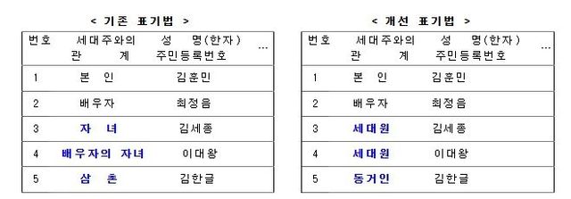 앞으로 등·초본에는 세대주의 배우자 외 가족(부모, 조부모, 형제자매 등)은 ‘세대원’, 그 외에는 ‘동거인’으로 표기된다. 다만, 민원인이 희망하는 경우 기존 표기법대로 등·초본에 상세한 가족 관계를 표기할 수 있다.