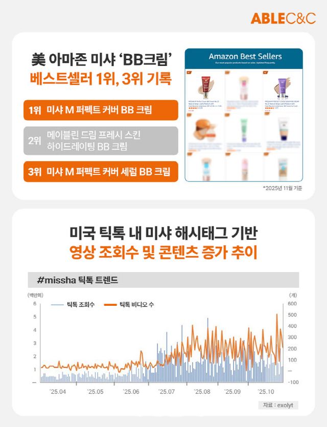 특히 미국 틱톡샵과 아마존 매출이 3분기 기준 전년 동기 대비 각각 580배, 약 2배 성장하며 브랜드 인지도와 실적을 견인했다. 아마존에서는 이달 기준 미샤의 대표 제품 ‘M 퍼펙트 커버 BB크림’이 BB크림 부문에서 1위를 기록했다. 전체 페이스 메이크업 부문 기준으로는 7위에서 5위로 상승했다. 유로모니터에 따르면 미국 색조 시장의 43%를 페이스 메이크업 카테고리가 차지하고 있다.