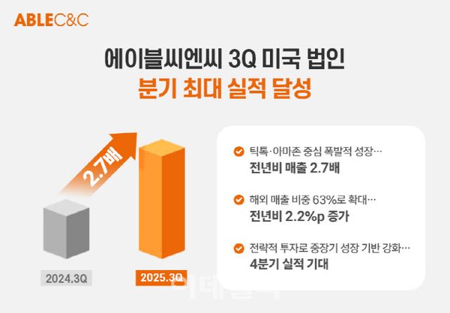 신유정 에이블씨엔씨 대표는 “이번 3분기는 해외 현지 마케팅 등 전략적 투자가 수반된 폭발적 성장의 신호탄으로 작용할 것”이라며 “미국과 유럽 중심의 글로벌 사업 성과가 본격적으로 확대되고 있는 만큼 4분기부터는 안정적 성장 궤도에 오를 것”이라고 말했다.
