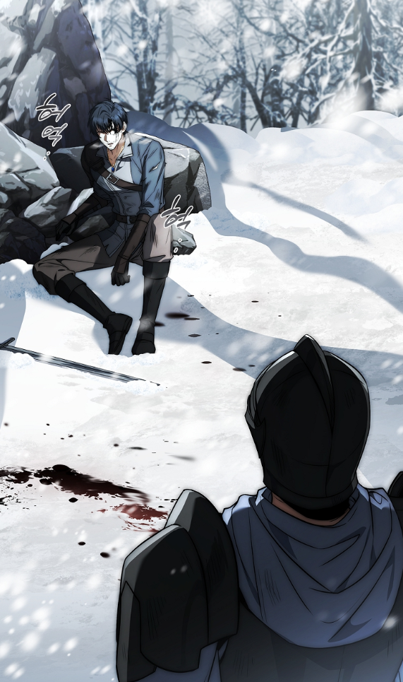 눈보라가 내리는 들판, 바닥에는 피가 흥건합니다.