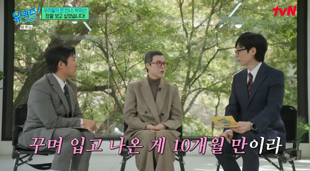 12일 방송된 tvN 예능 ‘유 퀴즈 온 더 블럭’에는 박미선이 게스트로 출연했다. 이날 유재석은 “앞에서 누나를 뵙고 왔다. 진짜 멋있더라”며 반가움을 드러냈고, 박미선은 짧은 머리로 등장해 눈길을 끌었다.