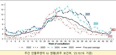 호주의 주간 인플루엔자 의사환자 현황 그래프를 보면, 2025년 시즌(파란 점선)이 최근 5년 평균(검은 실선)보다 높은 위치에서 유지되다가 3034주차(7월 말~8월 말) 사이에 정점을 형성했다. 이는 2024년(청록 실선) 시즌과 비슷한 양상이다.