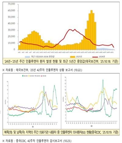 특히 우리나라와 인접한 동아시아 국가들에서 인플루엔자 활동이 2024년보다 조기에 시작되거나 환자 발생이 급증하는 등 유행 확산 양상을 보이고 있어 주목된다.
