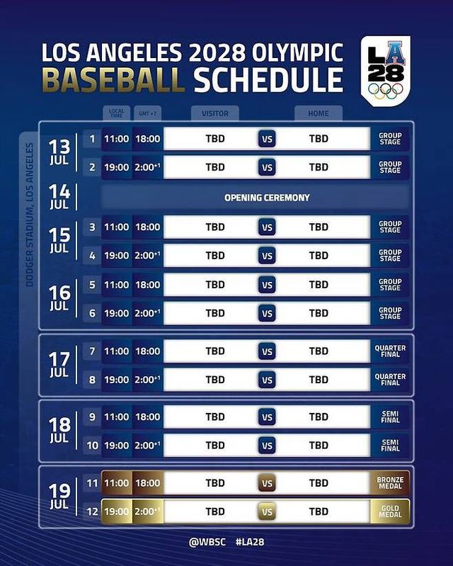 세계야구소프트볼연맹은 13일 “2028 LA올림픽 야구 경기는 현지시간으로 7월 13일 시작해 7월 19일까지 이어진다”고 밝혔다.