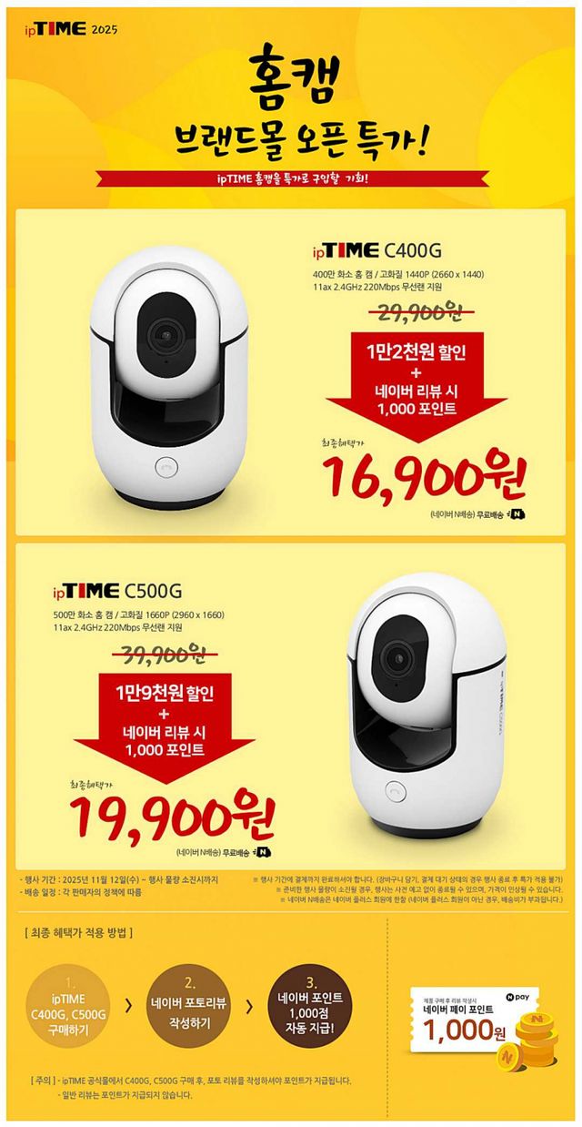 아이피타임 유무선 공유기 제조사 이에프엠네트웍스(아이피타임)가 공식 브랜드 몰 출범을 기념해 AI 스마트 홈카메라 C500G와 C400G의 특별 할인 행사를 시작했다. C400G는 40% 할인된 17,900원, C500G는 47% 할인된 20,900원으로 판매되며, 구매 후 포토리뷰 작성 시 네이버 포인트 1,000원이 지급돼 실질 구매가는 각각 16,900원과 19,900원이 된다.