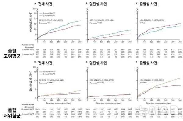출혈 고위험군 분석 결과, 이중 항혈소판제 3개월 유지군은 1개월 유지군과 비교해 출혈성 사건이 의미 있게 늘지 않았다. 반면 3개월 유지군은 혈전성 사건이 의미 있게 감소했고(5.8% vs 9.8%), 이로 인해 전체사건 발생률이 낮았다(14.0% vs 18.4%).