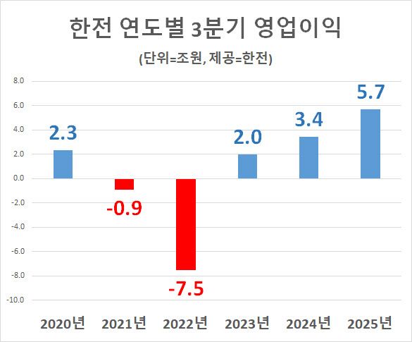 올해 누적 11조원 이상의 영업이익을 기록 중이지만 2021년 이후 한전의 누적 영업적자는 여전히 23조 1000억원이다. 자회사 실적을 배제한 별도 기준 누적 영업적자는 39조 1000억원이다. 당시 늘어난 부채로 한전이 부담하는 이자 비용은 현재 하루 120억원, 연 4조 4000억원으로 불어나 있다.