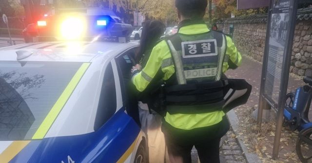 2026학년도 대학수학능력시험일인 13일 경찰이 A양을 서울 이화여고 앞에 내려주고 있다. / 경기남부경찰청