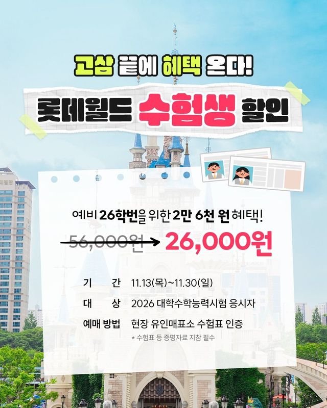 서울랜드도 '수고했수능' 이벤트를 열었습니다. 이에 따라 연말까지 수험표나 합격증을 제시하면 이용권을 55% 할인된 2만500원에 구입할 수 있다는군요. 동반 2인까지 동일 혜택을 받을 수 있다고 하니 방문 시 참고하세요. 롯데월드에선 서울과 부산 4개 사업장에서 오는 30일까지 이벤트를 진행합니다. 어드벤처와 어드벤처 부산 종합이용권을 각각 2만6000원과 2만원에 이용할 수 있으며 아쿠아리움과 서울스카이는 50% 할인가에 입장권을 구입할 수 있다고 합니다.