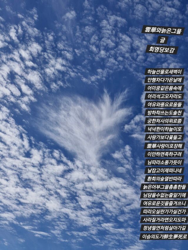하늘선물로새벽이 만행차다가온날에 어미꿈같은품속에 어리석고모자라도 여유와풍요로움들 방하착쓰는도솔천 궁한처사의위로쯤 넉넉한이하늘이또 사랑가보다꽃들고