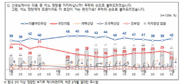 이 같은 강공 속에 노만석 검찰총장 직무대행이 사의를 표명하는 등 일정 성과도 있었지만, 민심은 여전히 싸늘하다. 13일 발표된 전국지표조사(NBS)에 따르면 정당 지지도는 민주당 42%, 국민의힘 21%였다. 직전 조사(민주당 39%, 국민의힘 25%) 대비 격차가 14%포인트(p)에서 21%p로 벌어졌다. 공세 강도와 여론 흐름이 정반대로 간 셈이다. 해당 조사는 휴대전화 가상번호(100%)를 이용한 전화면접 방식으로 이뤄졌다. 응답률은 14.8%, 표본오차는 95% 신뢰수준에서 ±3.1%p다. (자세한 내용은 중앙선거여론조사심의위원회 홈페이지 참고)