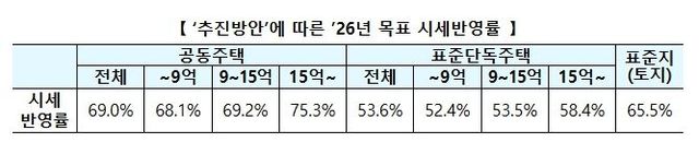 국토교통부 김윤덕 장관은 “현재 67개 제도에 활용되는 공적 기준가격인 부동산 공시가격은 국민 생활과 매우 밀접”하다고 하면서, “‘26년도 부동산 공시가격에 적용되는 시세반영률은 현재 수준으로 유지하되, 시세 산정의 정밀성도 높여, 부동산 시세 변동을 정확히 반영할 수 있도록 노력하겠다.”라고 밝혔다.