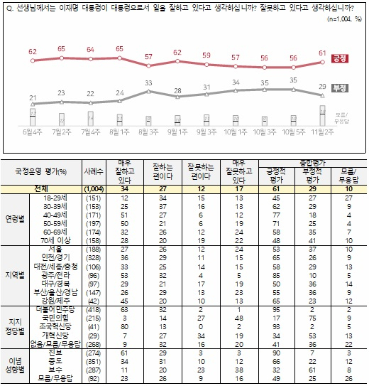 엠브레인퍼블릭·케이스탯리서치·코리아리서치·한국리서치가 지난 10~12일 전국 만 18세 이상 남녀 1004명을 대상으로 실시해 13일 발표한 전국지표조사(NBS) 결과에 따르면, 이 대통령 국정운영 평가에서 '잘하고 있다'는 긍정 평가가 61%로 집계됐다. 2주 전보다 5%포인트(P) 상승한 수치다. '잘못하고 있다'는 부정 평가는 6%P 하락한 29%였다.