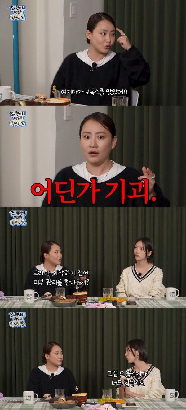 이어 조현아가 "피부 관리도 하냐"고 질문하다 표예진은 "언제 무슨 일이 생길지 모르고 일을 길게 쉴 타이밍이 잘 없어서 관리해야 된다"고 말했다.