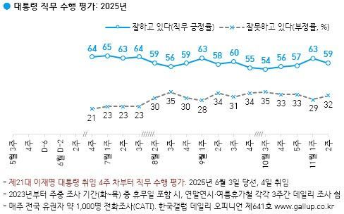 이재명 대통령의 직무 수행에 대해 '잘하고 있다'는 긍정 평가가 59%, '잘못하고 있다'는 부정 평가가 32%라는 여론조사 결과가 14일 나왔다.