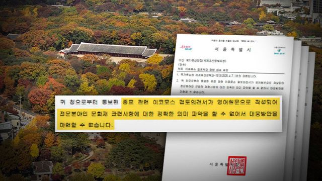 그런데 서울시는 “대응 방안을 마련할 수 없다”고 회신했다. 이유는 ‘영어 해석’이었다. 서울시가 4월11일 국가유산청에 회신한 공문을 보면, 서울시는 “종묘 관련 이코모스 검토의견서가 영어원문으로 작성돼 전문분야인 문화재 관련 사항에 대한 정확한 의미 파악을 할 수 없어서 대응방안을 마련할 수 없다”고 답했다.