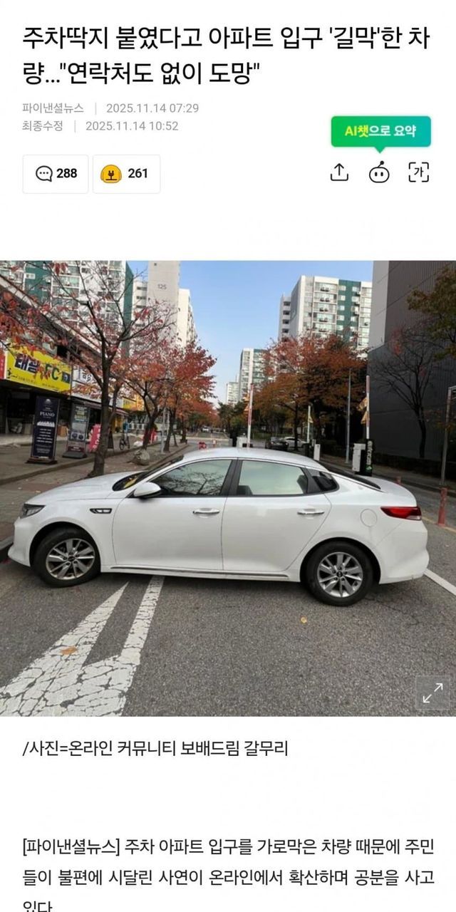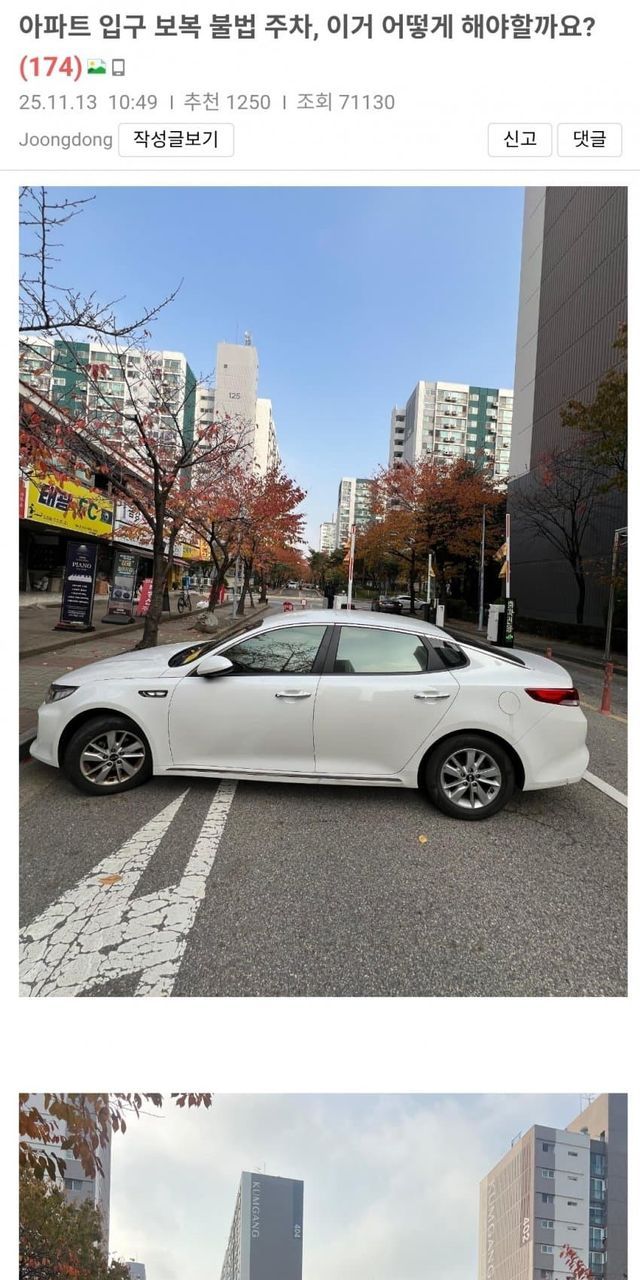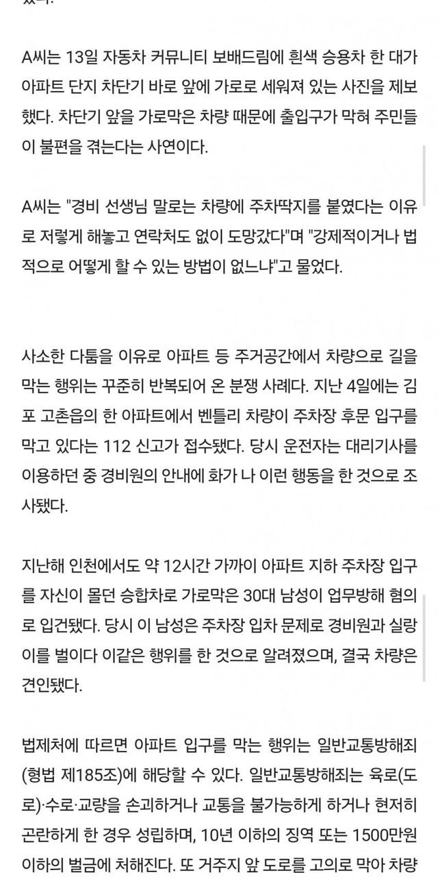펌) 아파트 입구 보복 불법 주차, 이거 어떻게 해야할까요?