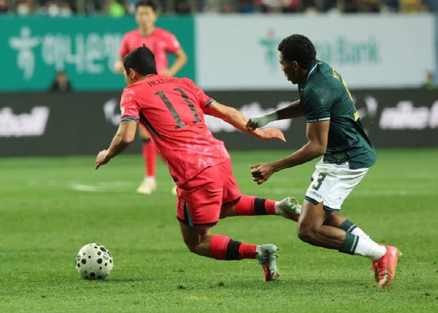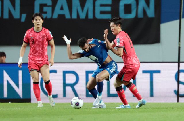 황희찬(울버햄프턴 원더러스)과 이강인(파리 생제르맹)이 있는 측면을 통하거나 후방에서 한 번의 긴 패스에 의존했다. 이날 최전방에 타깃형 공격수가 아닌 손흥민(로스앤젤레스FC)이 자리했다는 걸 고려하면 더 아쉬운 대목이었다. 결국 중앙에서 만들어지는 공격 장면은 찾아보기 힘들었다. 한국의 전반전 주요 장면은 두 번의 코너킥에서만 나온 배경이기도 했다.