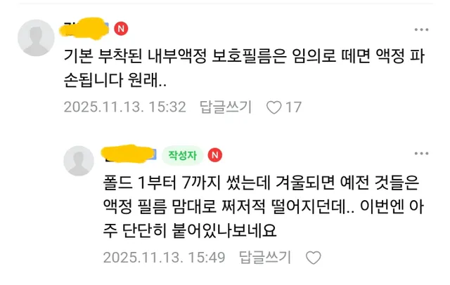 6. 댓글보면 액정필름 강제로 뜯으면 안된다는걸