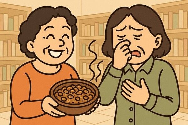 문제는 책방에 싸 오는 음식이었다. 친구는 점심마다 청국장, 젓갈 등 냄새나는 음식을 가져왔고, 남은 반찬은 냉장고에 보관했다.