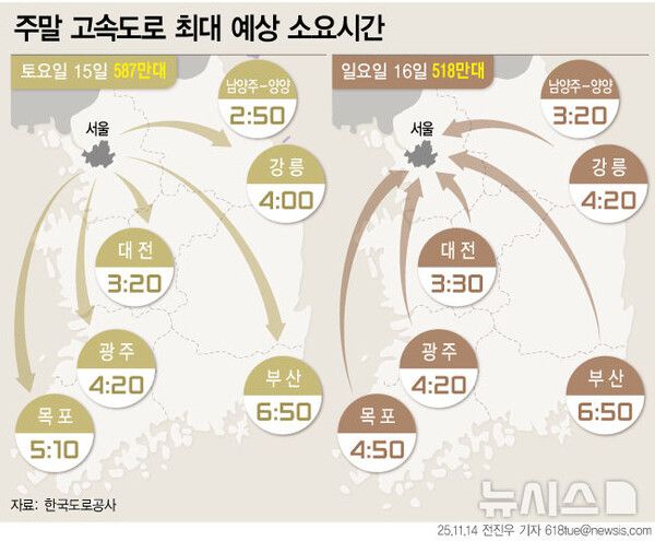 뉴시스 보도에 따르면, 한국도로공사에 따르면 이날 전국 고속도로 교통량은 518만대로 예상된다. 수도권에서 지방으로 빠져나가는 차량은 40만대, 지방에서 수도권으로 진입하는 차량은 46만대로 전망된다.