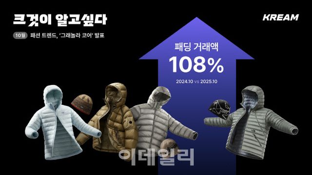 크림이 10월 발표한 패션 트렌드 리포트 ‘크것이 알고싶다(크알)’에 따르면 10월 한 달간 패딩과 바람막이의 거래액은 전년 동기 대비 각각 108%, 28% 증가했다. 이른 추위로 아우터 수요가 앞당겨진 영향과 더불어 자유롭고 활동적인 아웃도어 감성을 반영한 ‘그래놀라 코어’ 스타일의 확산이 영향을 미친 것으로 분석된다.