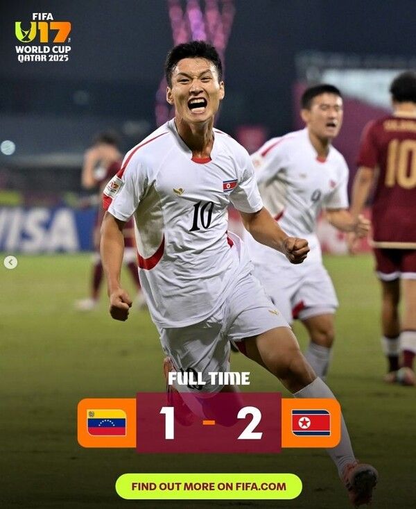뉴시스 보도에 따르면, 북한은 16일(한국 시간) 카타르 도하의 어스파이어존에서 열린 베네수엘라와의 대회 32강전에서 2-1 신승을 거뒀다.