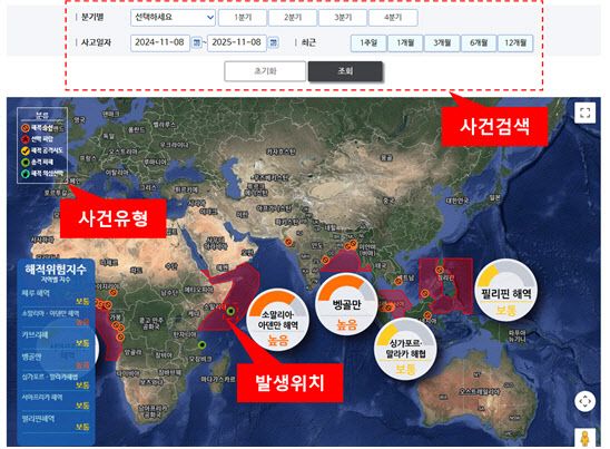 먼저, 해적위험지수와 함께 최근 1년 동안 발생한 해적 사건의 위치·개요·피해유형 등 자세한 정보를 연계하여 표출함으로써 주요 해역별로 사건이 자주 발생하는 구역을 이용자가 직관적으로 확인할 수 있게 되었다.