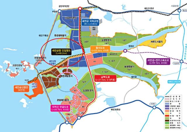 산업·연구용지, 관광·레저용지, 농생명용지, 배후도시용지 등 여러 권역으로 나눠 복합개발이 추진되고 있다. 신재생에너지(예: 해상풍력 등), 첨단농업, 관광·레저, 국제물류항만 등이 주요 축이다. 특히 해양항만, 철도, 도로 인프라 등을 연결해 ‘바다-땅-하늘’을 잇는 물류·교통거점으로도 계획돼 있다.
