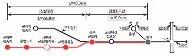 노선은 기존 선로 개량 19.0㎞(대야역∼옥구)와 신설 29.3㎞(옥구∼새만금 신항만)로 구성된다. 대야역 구간은 전철화 및 시설 개량이 이뤄지고, 옥구에서 신항만까지는 신규 선로가 놓인다. 정거장·신호장을 포함해 총 7개소가 계획됐으며 이 가운데 옥구, 새만금국제공항, 수변도시, 신항만 철송장은 신설 구간에 포함된다. 대야 정거장과 군산옥산신호장은 개량을 통해 활용하고, ‘새만금(장래)’ 정거장(또는 신호장)은 향후 열차 운행계획과 수요에 따라 설치 여부를 검토한다. 여객역은 대야, 새만금국제공항, 수변도시가 중심이 되고, 신항만 철송장은 화물 처리 기능에 특화된다. 역명은 개통 전 심의 절차를 거쳐 확정된다.