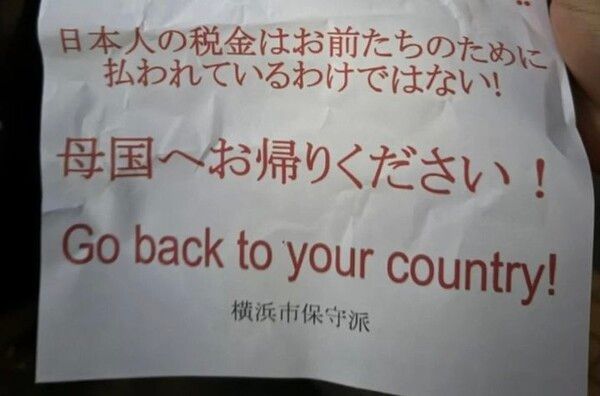 A씨가 공개한 사진 속 쪽지에는 "일본은 이민자를 원하지 않는다", "일본인의 세금은 외국인에게 쓰이는 것이 아니다" 등 혐오 문구가 적혀 있었다. 영어로 "네 나라로 돌아가라(Go back to your country)"라는 표현까지 포함돼 있었으며, 발신란에는 '요코하마시 보수파'라고 적혀 있었다.