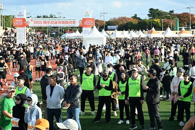 [한라일보] 16일 오전 '2025 제주감귤국제마라톤대회'의 출발점인 제주시 조천운동장. 이른 아침부터 속속 모여든 국내외 달림이들로 운동장은 출발 1시간여 전부터 가득찼다. 맑은 하늘 아래 완연한 가을 날씨를 마주한 참가자들은 "날씨 너무 좋다"라는 말을 하며 설렌 표정으로 레이스를 나설 준비를 했다.