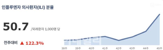 16일 질병관리청에서 운영 중인 의원급 의료기관의 인플루엔자(독감) 의사환자(ILI, 의심환자) 표본감시 결과, 2025년 45주차(11월2일~11월8일) 인플루엔자 의사환자 분율은 50.7명(외래환자 1000명당)으로 전주(22.8명) 대비 122.3% 증가했다. 전년 동기간(4.0명)과 비교하면 약 12.5배 높다.