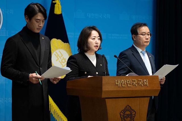 더불어민주당 정치검찰 조작기소대응특별위원회 소속 의원들이 16일 서울 여의도 국회 소통관에서 대장동 사건 정영학 녹취록 조작 정치검찰 규탄 기자회견을 하고 있다. 왼쪽부터 한준호, 이주희, 이건태 의원. / 뉴스1