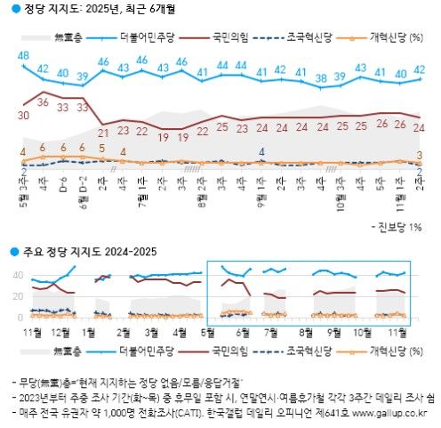 한국갤럽이 지난 11~13일 전국 만 18세 이상 남녀 1004명을 대상으로 정당 지지율 조사를 실시한 결과(무선 100%, 전화면접, 95% 신뢰수준에 ±3.1% 포인트)도 비슷했다. 민주당은 2%p 오른 42%, 국민의힘은 2%p 내린 24%였다.
