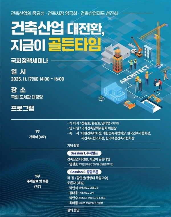 뉴시스 보도에 따르면, 건축의 제도적 한계와 문제점을 분석해 혁신 방안을 찾는 이번 토론회는 국회 국토교통위원회 소속 더불어민주당 천준호, 한준호, 염태영 의원이 공동 개최한다.