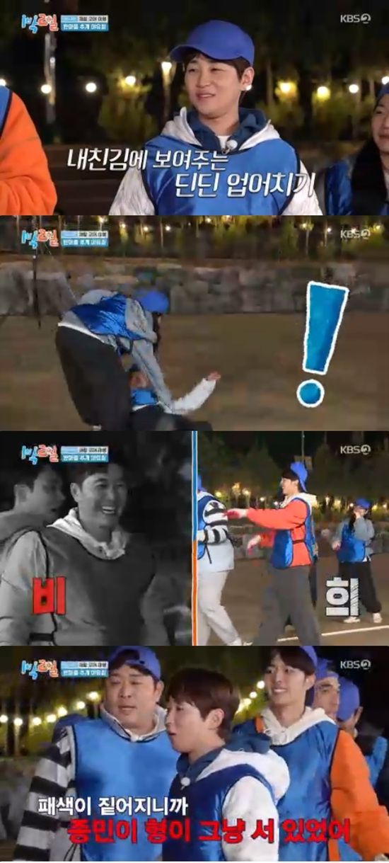 딘딘은 최백코어 팀의 승리가 확정된 후 "패색이 짙어지니까 종민이 형이 그냥 서 있었다"고 폭로했다.
