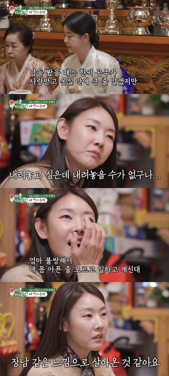 잠시 후 며느리 무속인이 들어왔다. 무속인은 "올해 들삼재다. 내년에는 눈물 삼재, 후년에는 나가는 삼재다. 계해년 한씨 집안에 원래 장군이 태어났어야 하는데 여자로 태어나서 남자아이처럼 길러졌다. 부모가 있다고 하더라도 내 정을 다른 형제에게 다 뺏기고 부모의 사랑을 다 못 받았다. 너무 불쌍하고 안타깝다. 어릴 적 사주를 보니 눈물이 난다"고 이야기했다.