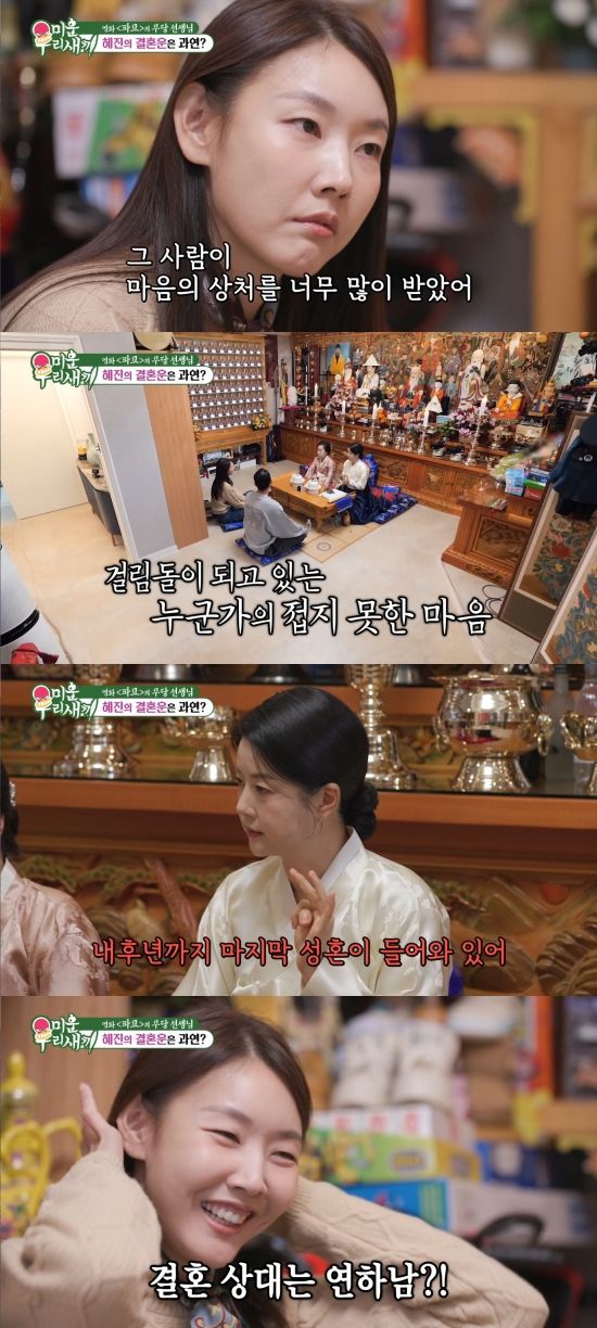 이어 무당은 "결혼할 사람이 있었다. 외국에 잠시 계셨을 때 그랬나. 장거리 연애를 했다. 결혼할 사람이 마음의 상처를 너무 많이 받았다. 죽은 귀신이 따라다니는 게 아니라 산 귀신의 마음에 한혜진 씨가 푹 들어갔다. 헤어진 사람이 아직 마음에 품고 있다. 그 사람이 한씨 공주를 마음에 품다 보니 만나는 사람마다 깨진다. 또 만나는 남자들은 죄다 먹여살렸다. 그것만 하면 집 한 채는 지었다. 나는 안 입고 안 먹고 그놈 명품 사 입혔다. 할머니가 너무 애틋하고 안 됐단다. 왜 그렇게 살았냐"고 물었다. 이에 한혜진은 "어릴 때 만난 남자친구들이 늘 불쌍하고 가여웠다"고 말했다.