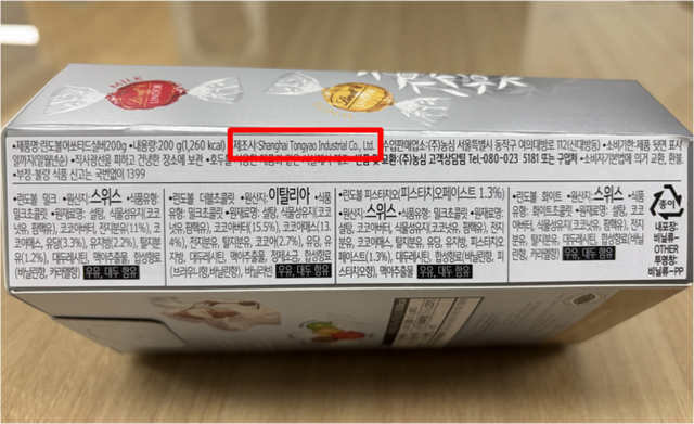 다만 어쏘티드 제품 특성상 하나의 박스에 여러 개의 낱알 초콜릿(린도볼)이 함께 들어가기 만큼 해당 낱개를 포장·소분하는 '포장 공정'이 중국에서 이뤄지며 이 때문에 국내법상 제조지 표기가 중국으로 등록된 것이라는 설명을 덧붙였다.